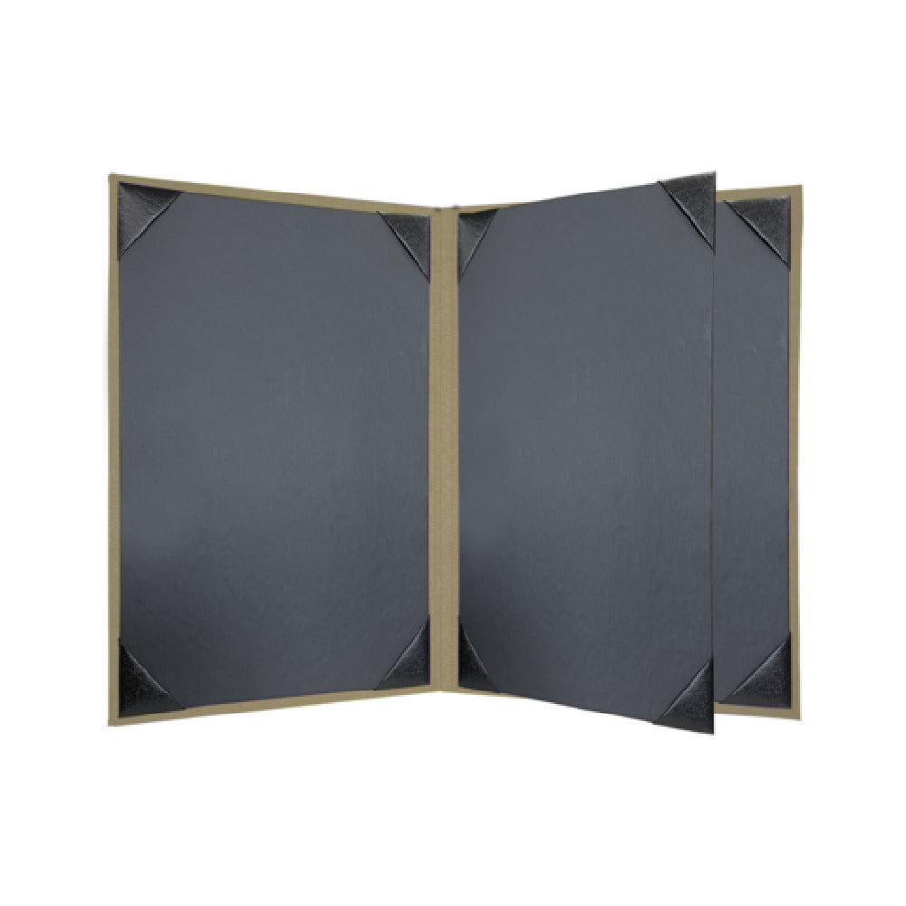 Risch, EVERGREEN-4V 5.5X8.5, Evergreen hardback bio-friendly faux-leather Menu Cover (specify color), 5-1/2" x 8-1/2", booklet, 4 view, black cards with black album style corner tabs to hold menu inserts, Made in USA (minimum order 25 each) (Packed By: 25 Each Per Case)