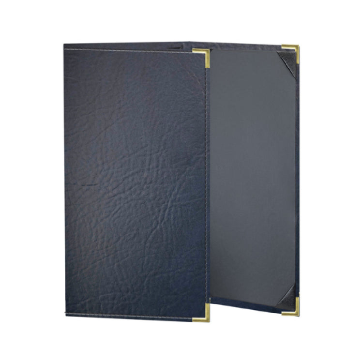 Risch, HARST-3V 8.5X14, Harley Deluxe padded antibacterial/antimicrobial faux-leather Menu Cover (specify color), 8-1/2" x 14", fold-out, 3 view, stitched edges with metal corners (specify color), black cards with black album style corner tabs to hold menu inserts, Made in USA (minimum order 25 each) (Packed By: 25 Each Per Case)