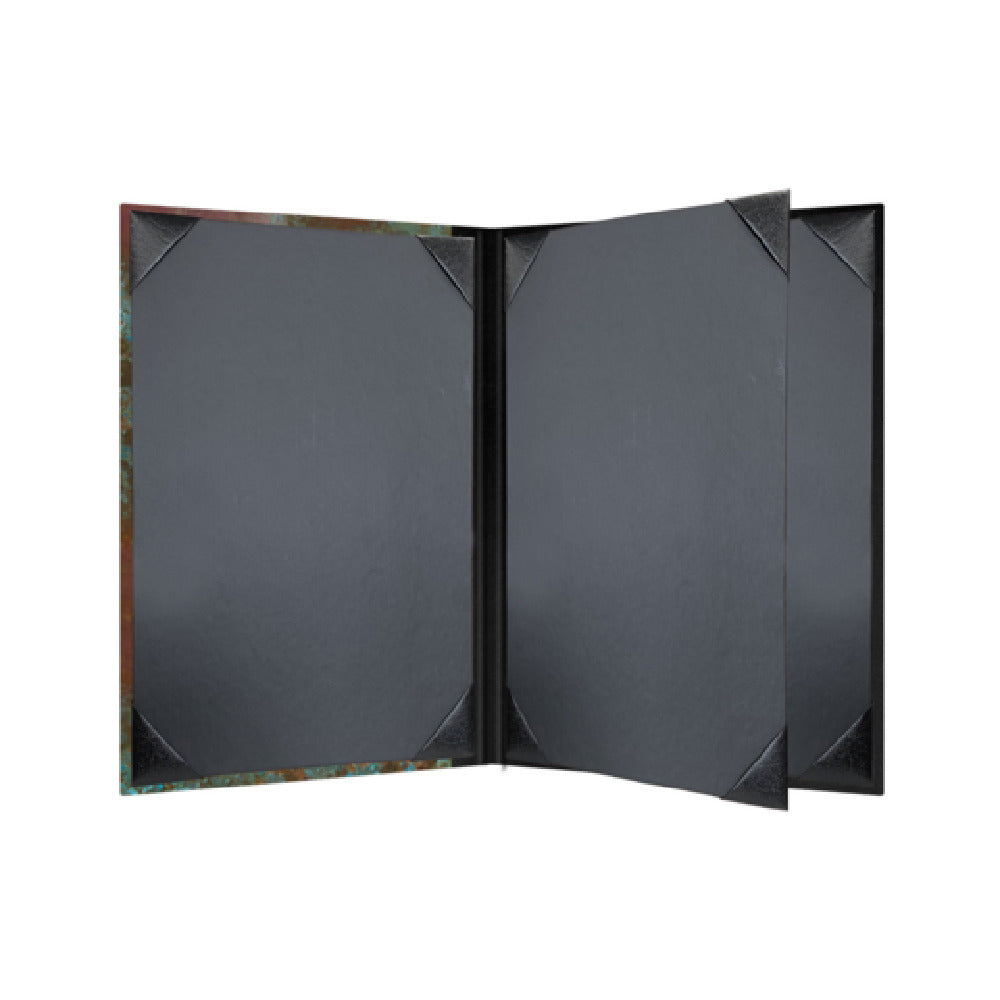 Risch, PATINA-4V 5.5X8.5, Patina hardback authentic copper Menu Cover (specify color), 5-1/2" x 8-1/2", booklet, (4) view, bonded leather spine and back (specify color), black cards with black album style corner tabs to hold menu inserts, Made in USA (minimum order 25 each) (Packed By: 25 Each Per Case)