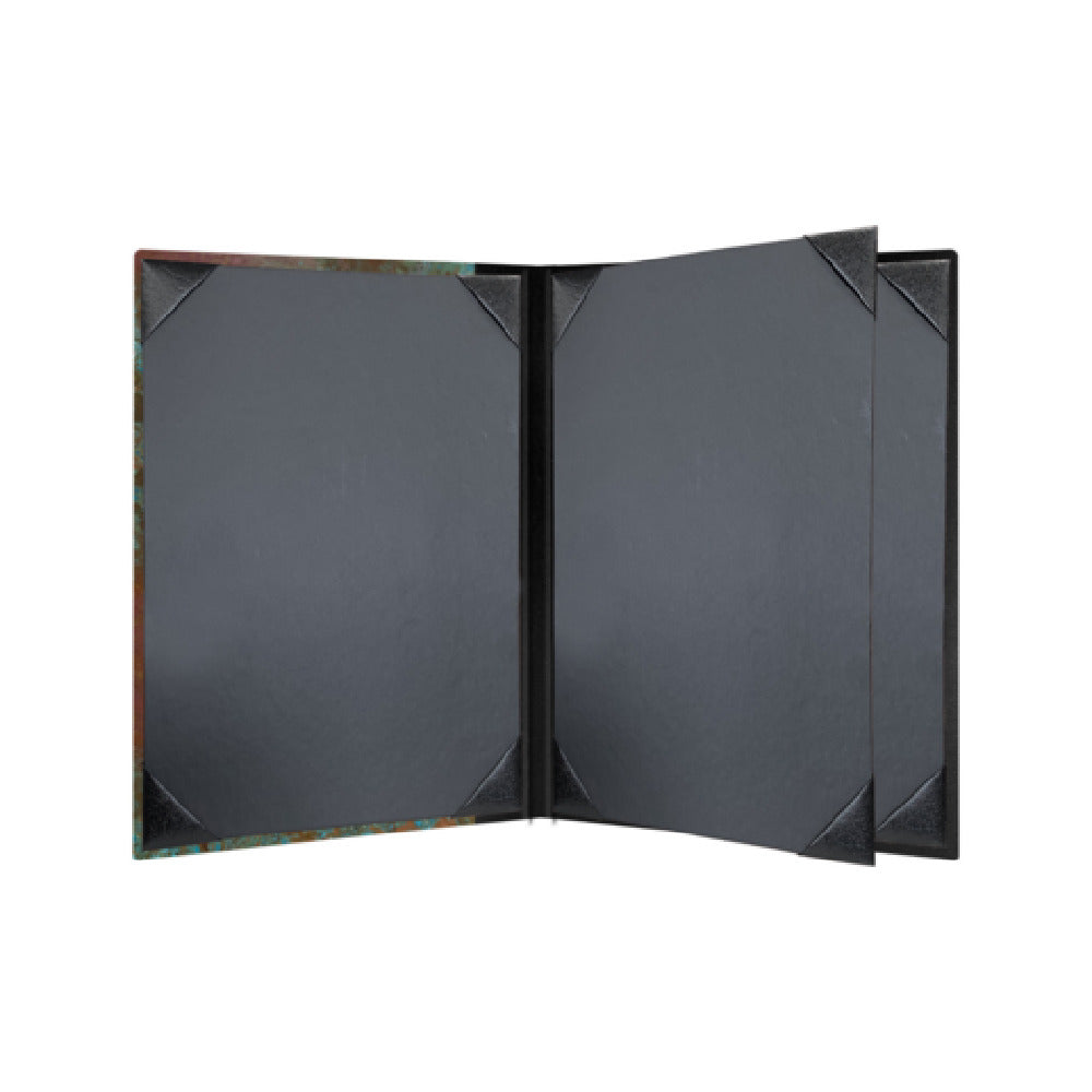 Risch, PATINA-4V 8.5X11, Patina hardback authentic copper Menu Cover (specify color), 8-1/2" x 11", booklet, (4) view, bonded leather spine and back (specify color), black cards with black album style corner tabs to hold menu inserts, Made in USA (minimum order 25 each) (Packed By: 25 Each Per Case)