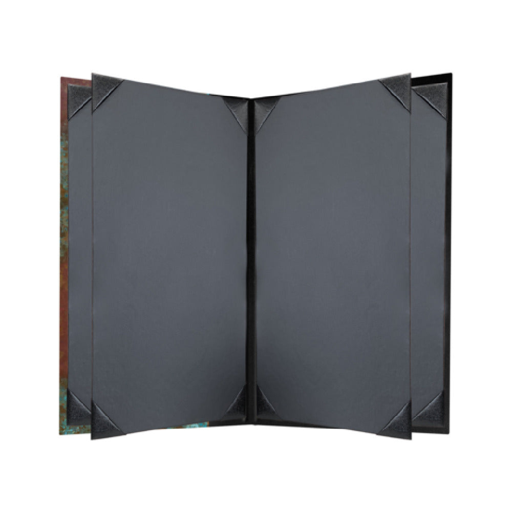 Risch, PATINA-6V 8.5X14, Patina hardback authentic copper Menu Cover (specify color), 8-1/2" x 14", booklet, (6) view, bonded leather spine and back (specify color), black cards with black album style corner tabs to hold menu inserts, Made in USA (minimum order 25 each) (Packed By: 25 Each Per Case)