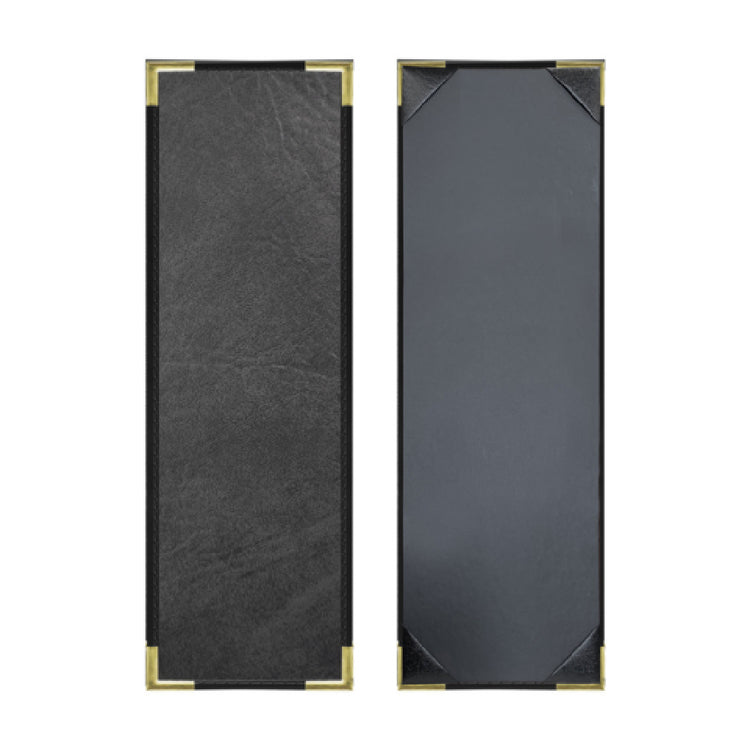 Risch, SEVDX-1V 4.25X14, Seville Deluxe hardback antibacterial/antimicrobial faux-leather Menu Cover (specify color), 4-1/4" x 14", single, 1 view, stitched leatherette binding, metal corners (specify color), black card with black album style corner tabs to hold menu insert, Made in USA (minimum order 25 each) (Packed By: 25 Each Per Case)