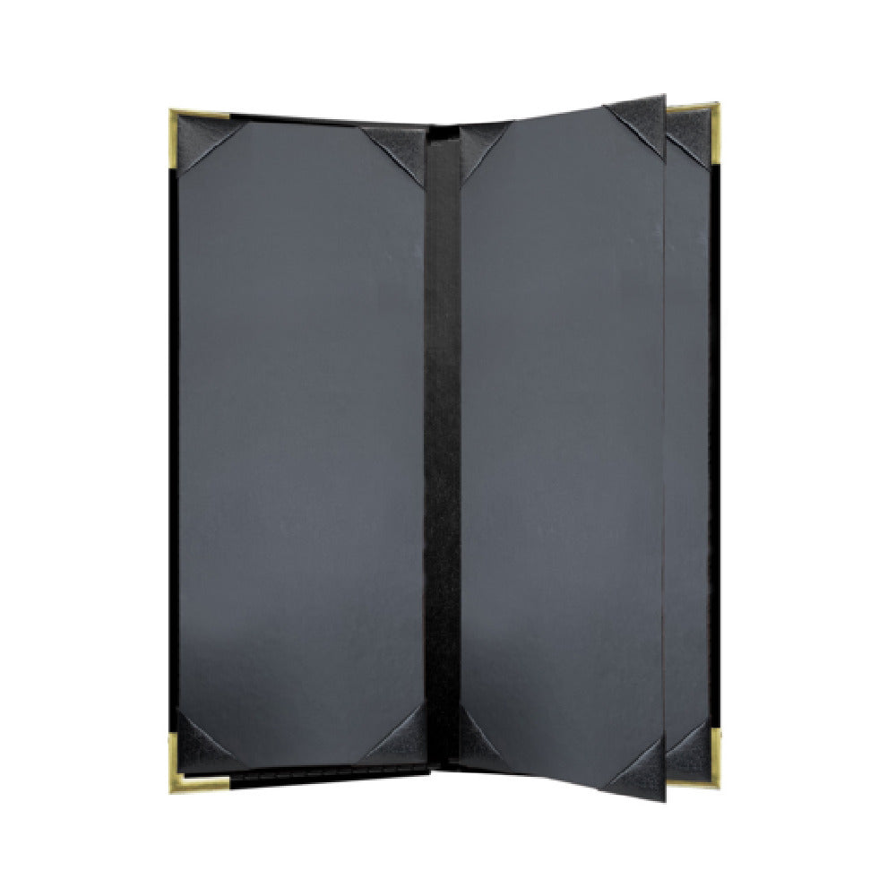 Risch, SEVDX-4V 4.25X11, Seville Deluxe hardback antibacterial/antimicrobial faux-leather Menu Cover (specify color), 4-1/4" x 11", booklet, 4 view, stitched leatherette binding, metal corners (specify color), black cards with black album style corner tabs to hold menu inserts, Made in USA (minimum order 25 each) (Packed By: 25 Each Per Case)