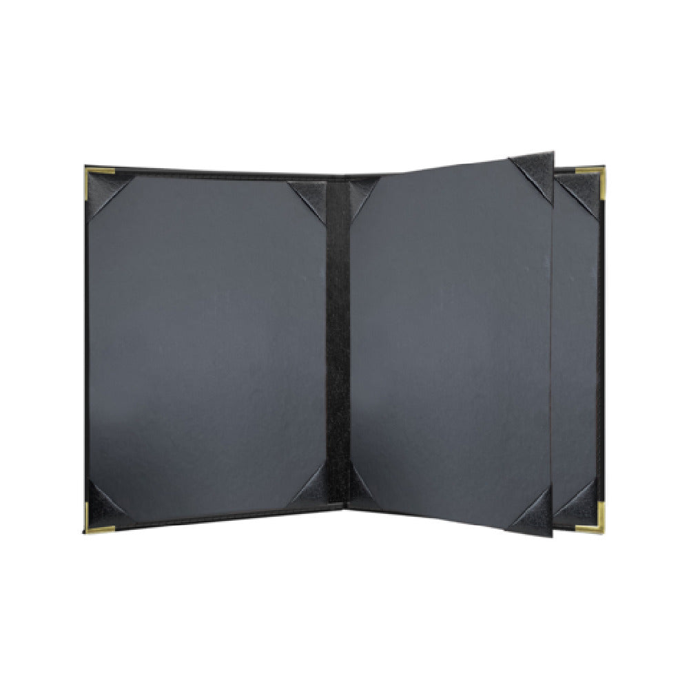 Risch, SEVDX-4V 8.5X11, Seville Deluxe hardback antibacterial/antimicrobial faux-leather Menu Cover (specify color), 8-1/2" x 11", booklet, 4 view, stitched leatherette binding, metal corners (specify color), black cards with black album style corner tabs to hold menu inserts, Made in USA (minimum order 25 each) (Packed By: 25 Each Per Case)