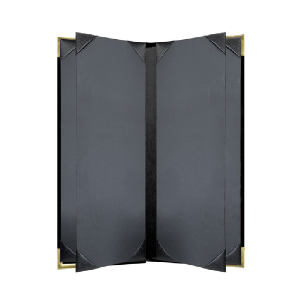 Risch, SEVDX-6V 4.25X11, Seville Deluxe hardback antibacterial/antimicrobial faux-leather Menu Cover (specify color), 4-1/4" x 11", booklet, 6 view, stitched leatherette binding, metal corners (specify color), black cards with black album style corner tabs to hold menu inserts, Made in USA (minimum order 25 each) (Packed By: 25 Each Per Case)