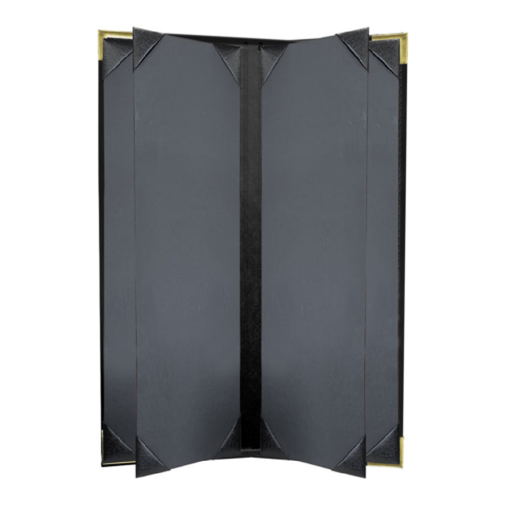 Risch, SEVDX-6V 4.25X14, Seville Deluxe hardback antibacterial/antimicrobial faux-leather Menu Cover (specify color), 4-1/4" x 14", booklet, 6 view, stitched leatherette binding, metal corners (specify color), black cards with black album style corner tabs to hold menu inserts, Made in USA (minimum order 25 each) (Packed By: 25 Each Per Case)