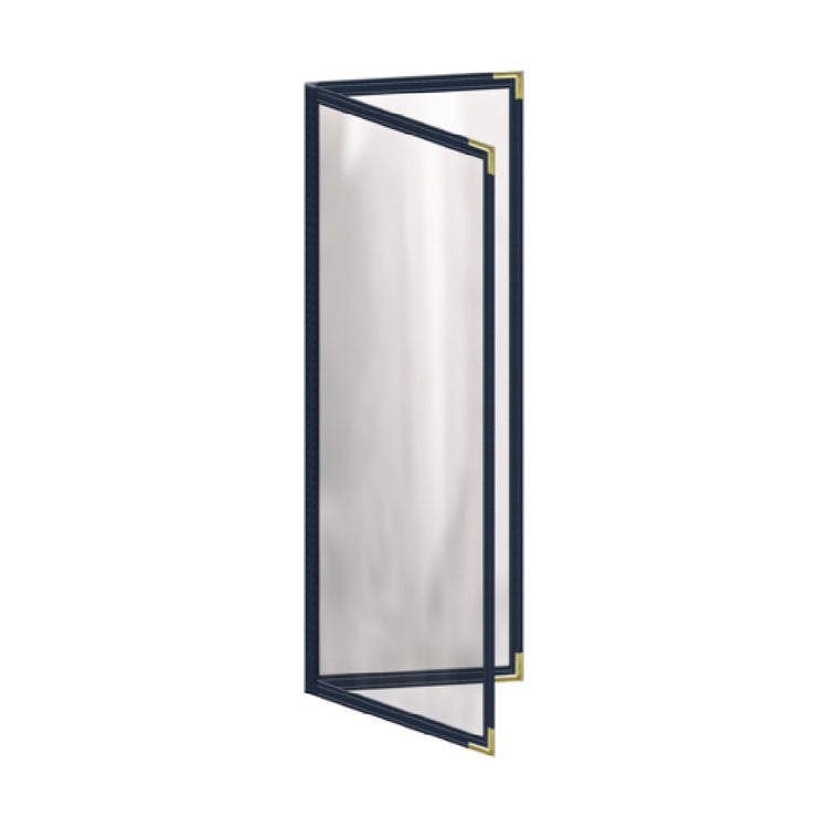 Risch, TED 4.25X14, Deluxe Clear Sewn Menu Cover, 4-1/4" x 14", double, 4 view, turned in edge, reinforced binding with matching thread, double stitched, metal decorative corners, Made in USA (minimum order 24 each)