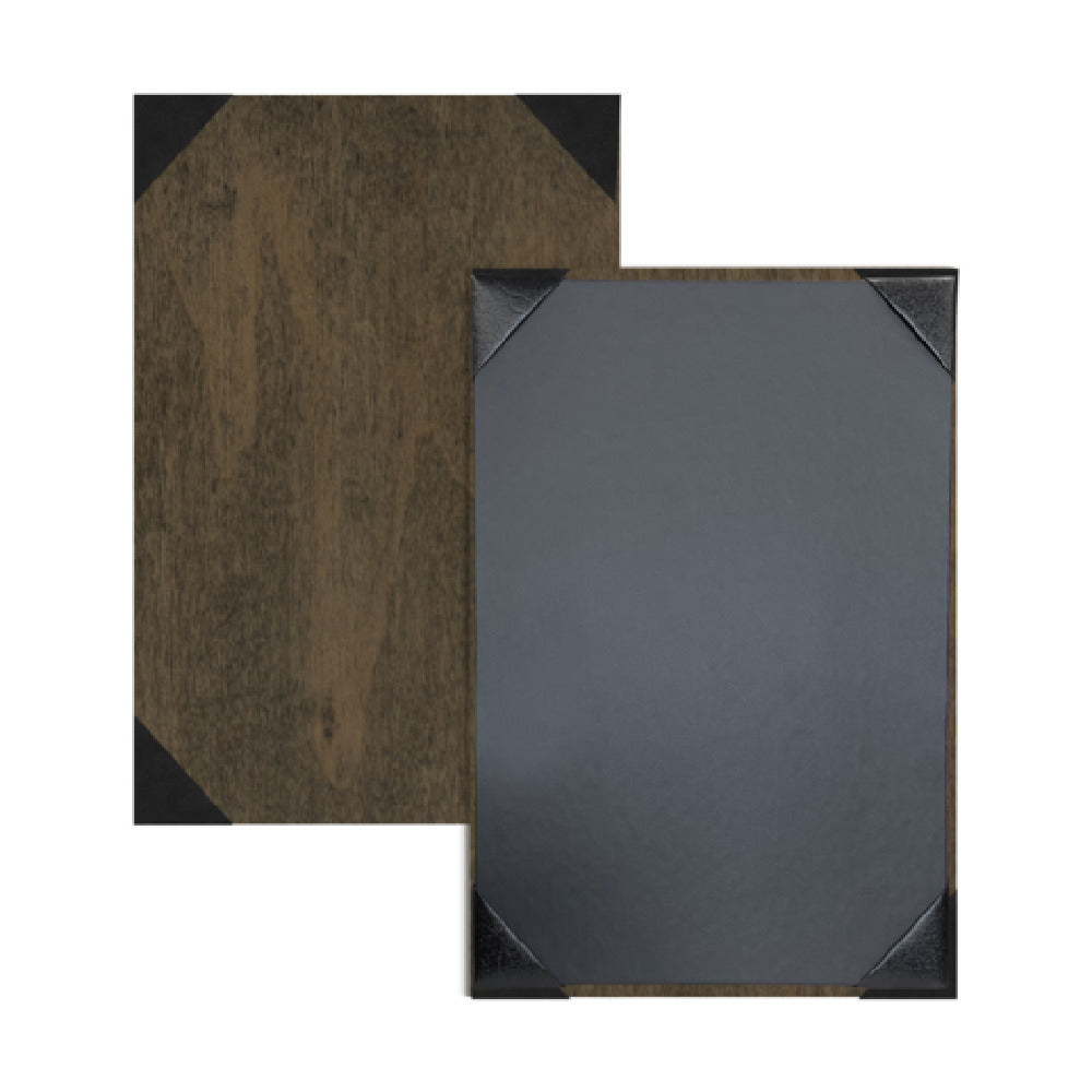 Risch, WOOD-1V 5.5X8.5, Authentic Wood Menu Cover (specify color), 5-1/2" x 8-1/2", single, 1 view, bonded tuxedo leather on corners (specify color), black card with black album style corner tabs to hold menu insert, Made in USA (minimum order 25 each) (Packed By: 25 Each Per Case)