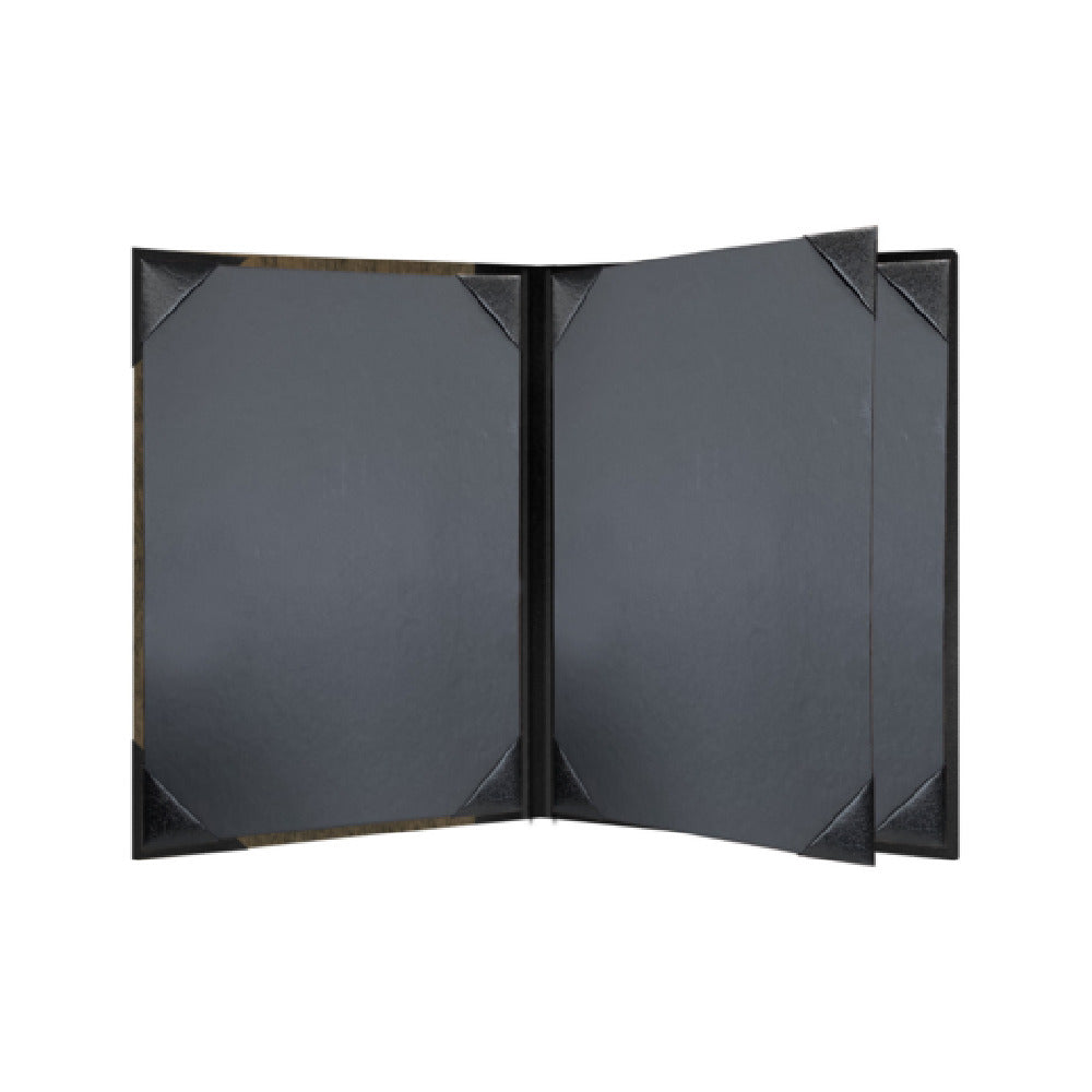 Risch, WOOD-4V 8.5X11, Authentic Wood Menu Cover (specify color), 8-1/2" x 11", booklet, 4 view, wood front panel, bonded tuxedo leather on spine, back, and right corners (specify color), black cards with black album style corner tabs to hold menu inserts, Made in USA (minimum order 25 each) (Packed By: 25 Each Per Case)