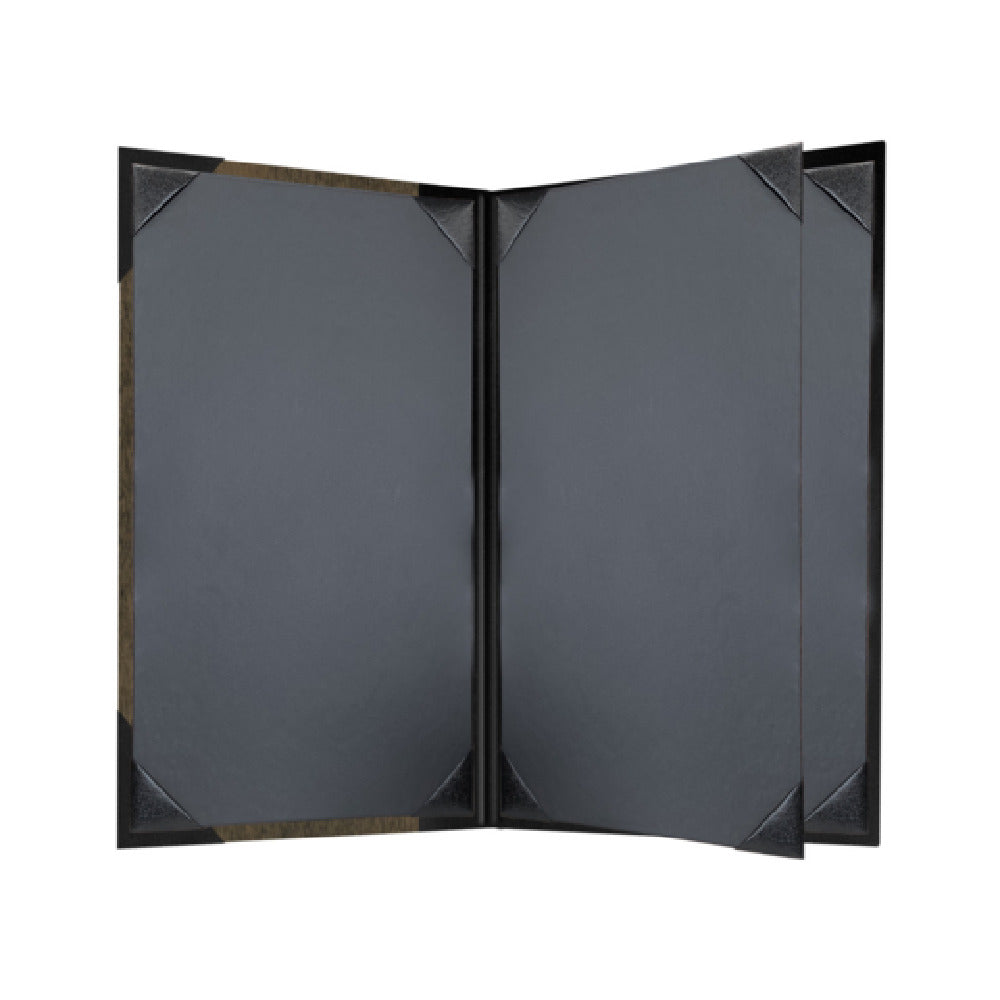 Risch, WOOD-4V 8.5X14, Authentic Wood Menu Cover (specify color), 8-1/2" x 14", booklet, 4 view, wood front panel, bonded tuxedo leather on spine, back, and right corners (specify color), black cards with black album style corner tabs to hold menu inserts, Made in USA (minimum order 25 each) (Packed By: 25 Each Per Case)