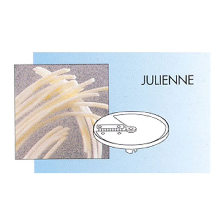 The Robot Coupe 28054W Julienne Disc 8 x 8mm (5/16") is a precision-engineered accessory designed to enhance the versatility of food processors in commercial kitchens. With precise measurements of 8 x 8mm (5/16"), this disc is tailored for creating consistent julienne cuts, contributing to the efficiency and aesthetic appeal of culinary presentations. The disc is compatible with select Robot Coupe models, ensuring seamless integration for users seeking to expand their food processing capabilities. Its meticulous construction allows for uniformity in cut size, which is crucial for professional kitchens that prioritize presentation and consistency in their dishes. Ideal for catering to various segments within the food industry, from restaurants to catering services, the Robot Coupe 28054W Julienne Disc offers a specialized solution for preparing vegetables and other ingredients in a precise, time-saving manner. By incorporating this julienne disc, chefs and kitchen staff can achieve high-quality results with ease, enhancing the overall productivity and creative potential of their culinary operations. The disc's robust design not only facilitates high-volume use but also ensures durability and reliability, making it an indispensable tool for any food service establishment aiming to maintain high standards of food preparation.