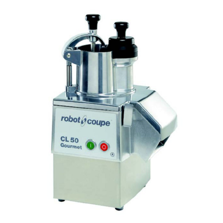 The Robot Coupe CL50GOURMET NODISC Commercial Food Processor Vegetable Prep Attachment With Kidney Shaped & Cylindrical Hopper is a specialized piece of equipment designed for professional kitchens requiring high efficiency and performance in vegetable preparation. This commercial-grade appliance features a powerful 1-1/2 HP motor capable of single-speed operation at 425 RPM, making it adept at handling large volumes of produce with ease. Operating on 120v/60/1-ph electricity and drawing 13.5 amps, it connects via a NEMA 5-15P plug, ensuring compatibility with standard kitchen electrical systems. The unit is particularly versatile, featuring both a kidney-shaped and cylindrical hopper to accommodate various types and sizes of vegetables. Though it does not include a bowl, it is equipped with a convenient removable catch pan with a lid to facilitate efficient operation and clean-up. Constructed with a robust stainless steel base, the CL50GOURMET NODISC is built to withstand the rigorous demands of a commercial kitchen environment. Recognized for its adherence to safety and sanitation standards, it is cETLus and ETL-Sanitation certified. This model is an ideal choice for culinary professionals who value durability and efficiency in their food processing equipment.