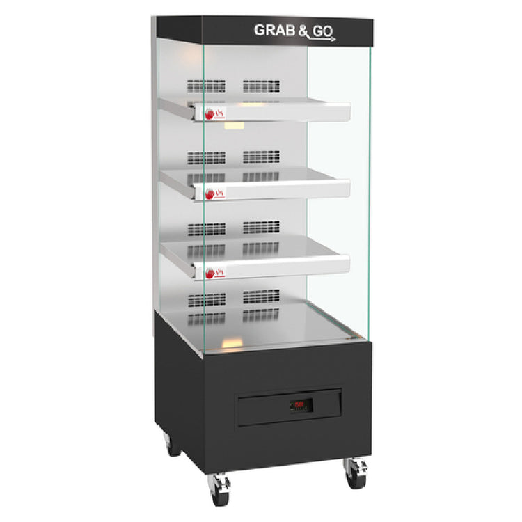 Rotisol USA, 6MCV4LS, Essentiel Heated Display Merchandiser, 25-5/8"W, front-loading, 21-42 chickens in shells capacity, digital thermostat, radiant heat, 145° to 158°F temperature range, (4) shelves inclined at 5°, LED light per shelf, glass side panels, 'GRAB & GO' roof banner, stainless steel & black epoxy finish, 4.3kW, 208-240v/60,18.0 amps, 1-phase