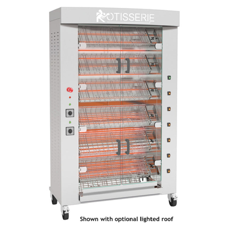 Rotisol USA, FBS1160-6E-SS, FlamBoyant SPATCHCOCK Rotisserie Oven, electric, floor model, 45-1/8"W, (18-24) spatchcock chicken or (24-30) whole chickens on V-shaped spits capacity, (6) spatchcock basket spits (BCR1160) included, (6) individual motors, drip pan & drain plug, halogen lamp, K-glass doors, stainless steel finish, casters with brakes, 22.53 kW, 208-240v/60/3-ph, 62.5 amps, cETLus, ETL-Sanitation
