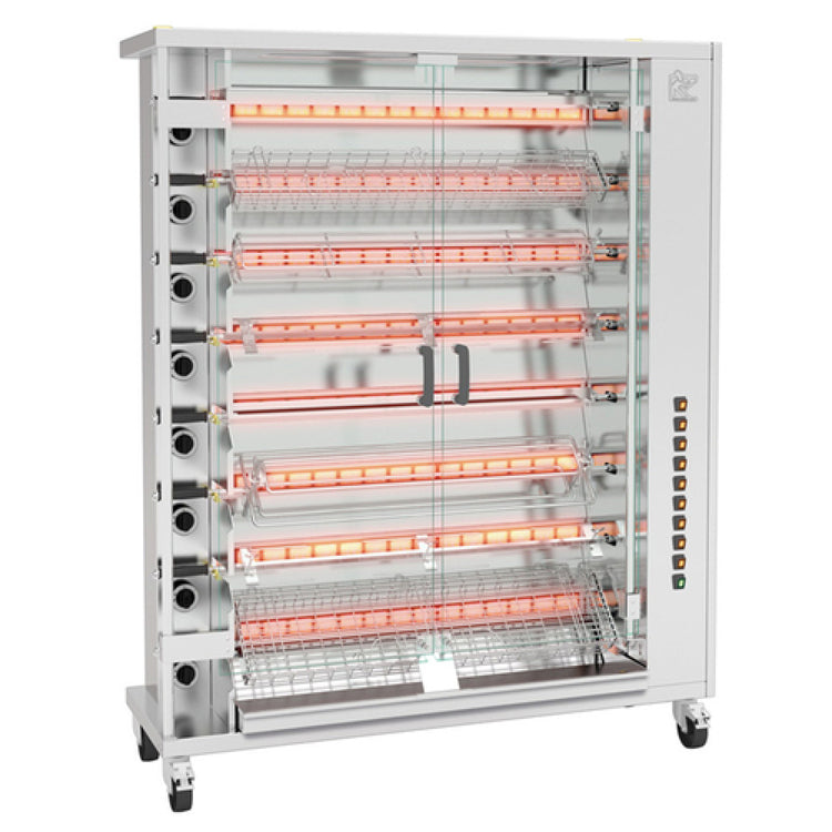 Rotisol USA, FF1425-8G-SS_NAT, FauxFlame™ Rotisserie Oven, gas, floor model, 56-1/8" W, (8) stainless steel V-shaped spits, 40-48 chicken capacity, (8) individual motors, drip pan with drain plug, halogen lamp, tempered glass doors, stainless steel finish, 121,000 BTU, 0.59 kW, 208-230v/60/1-ph, 3 amps, cETLus, ETL-Sanitation