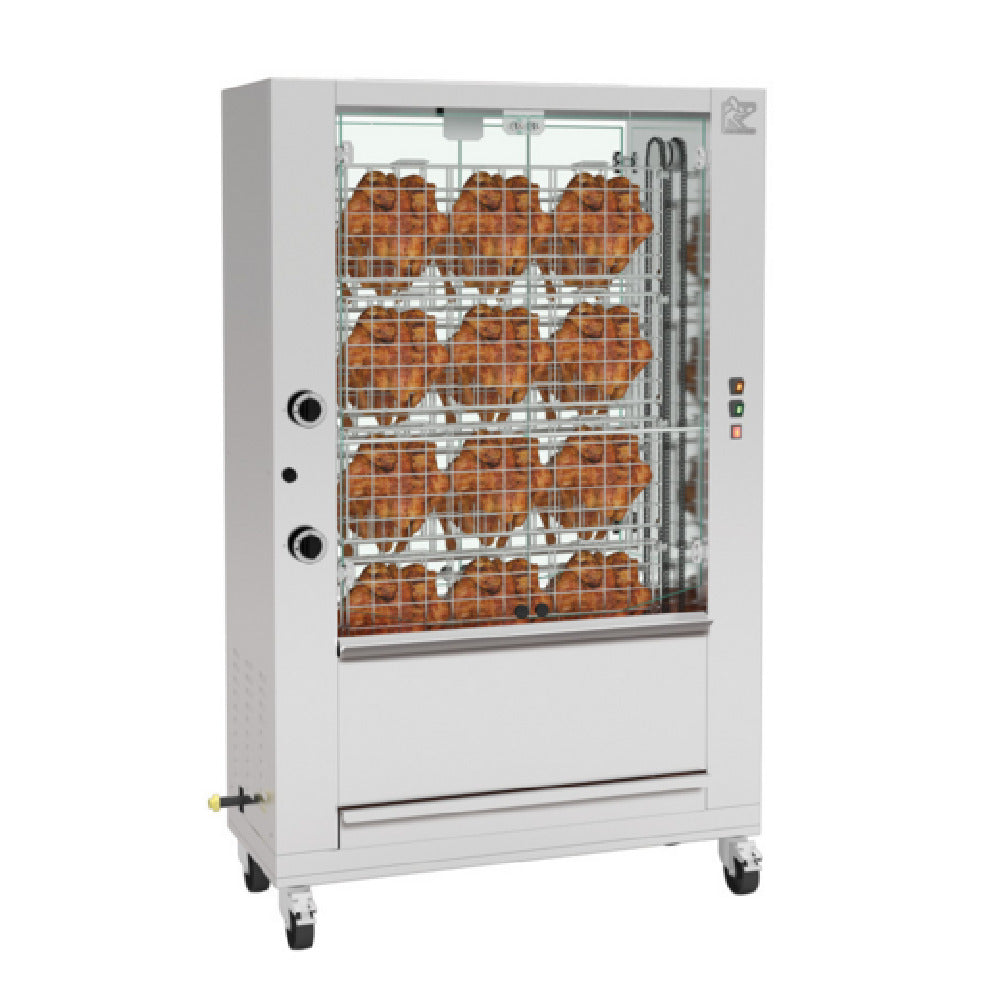Rotisol USA, FFS1100-4G-BRASILIA-PT_LP, FauxFlame™ SPATCHCOCK Rotisserie Oven, gas, floor model, 42-1/2" W, (9) spatchcock basket spits, 27 spatchcock chicken capacity, drip pan with drain plug, halogen lamp, pass-through with 4 tempered glass doors, stainless steel finish, 41,000 BTU, 0.23 kW, 208-230v/60/1-ph, 1.1 amps, cETLus, ETL-Sanitation