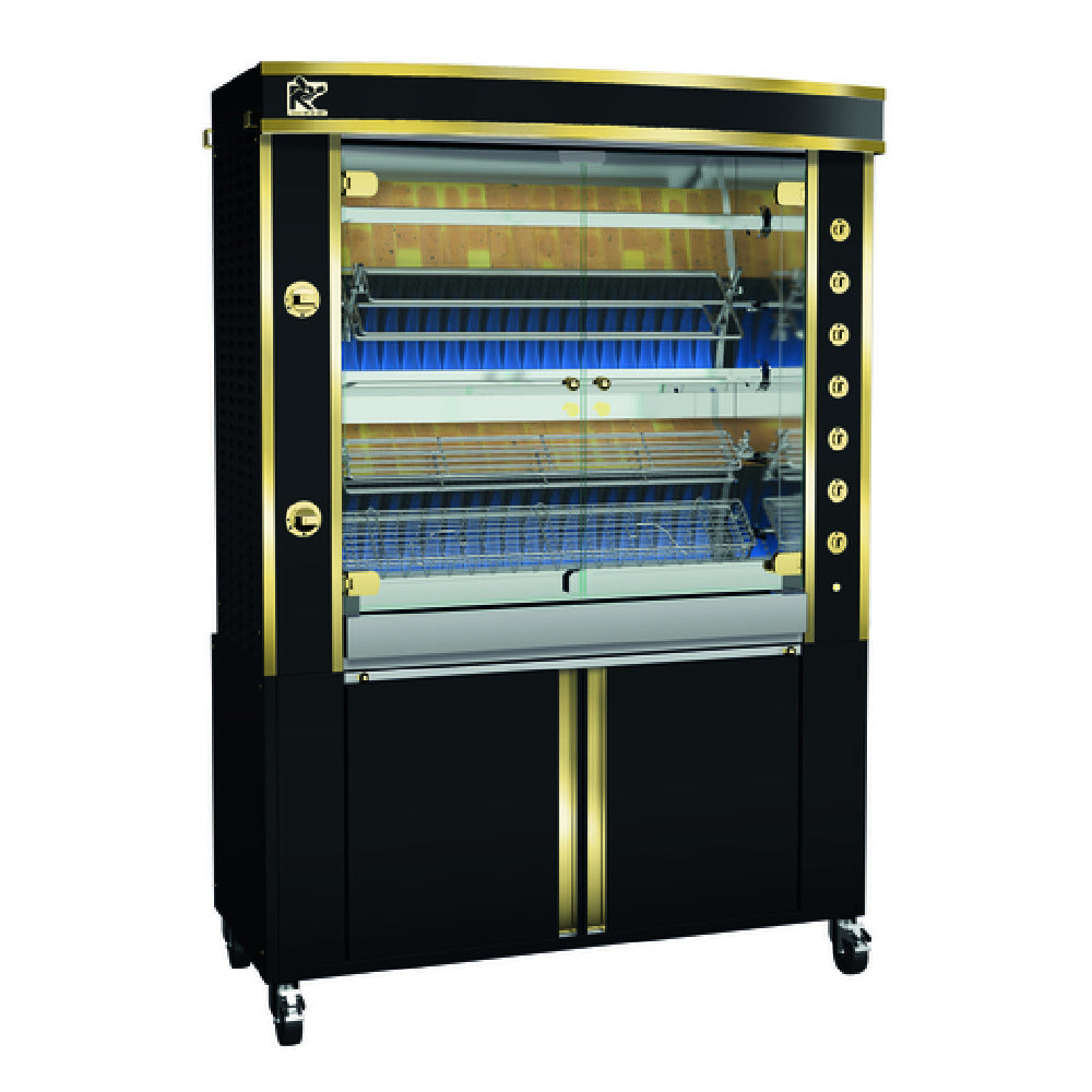 Rotisol USA, GF1375-5G-LUX_LP, GrandFlame Rotisserie Oven, gas, countertop, 56-1/8" W, (5) stainless steel V-shaped spits, 25-30 chicken capacity, (5) individual spit motors, tempered glass doors, drip pan with drain plug, halogen lamp, LUX finish- full-body finish in black porcelain enamel with chrome or brass trim (5% surcharge for other colors from the Rotisol chart), 82,000 BTU, 0.45 kW, 208-230v/60/1-ph, 2.16 amps, cETLus, ETL-Sanitation