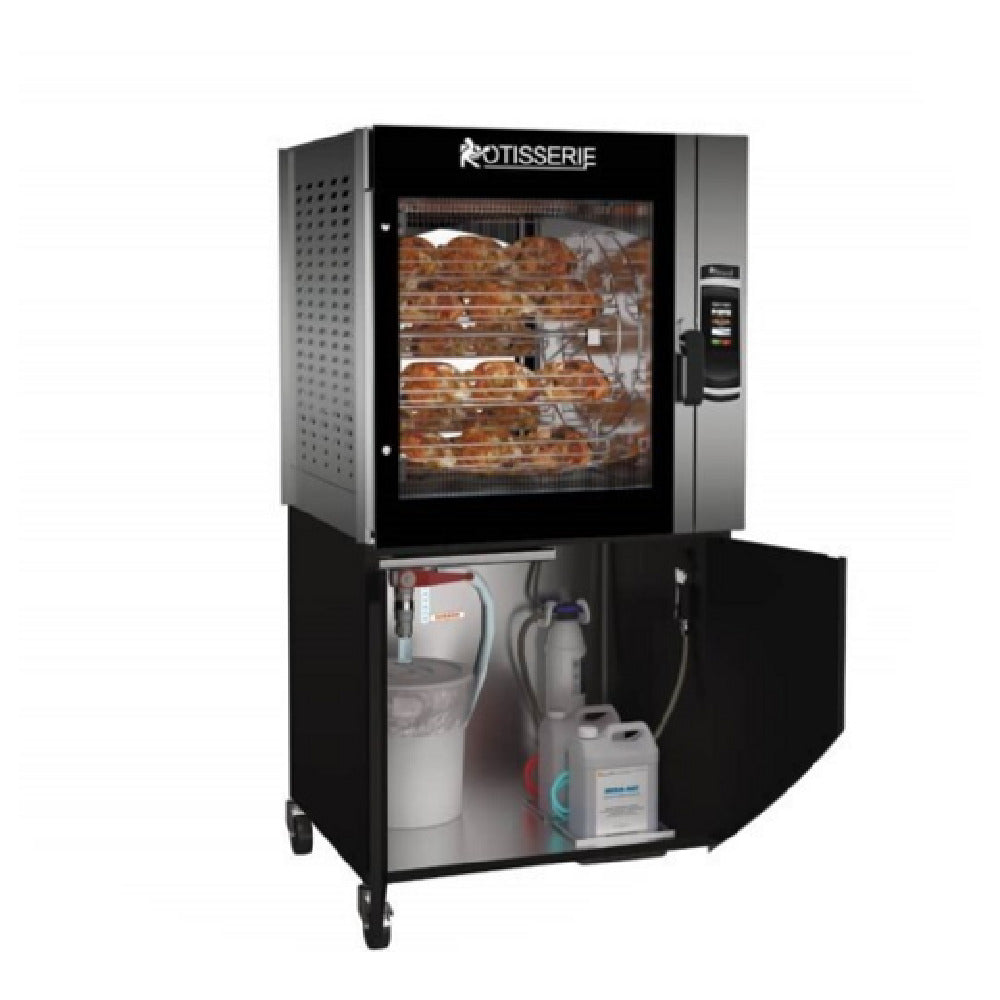 Rotisol USA, MC 8.760, Master Clean Rotisserie Oven, electric, countertop, 42-1/4"W x 34-7/8"D x 72"H, automatic cleaning, stainless steel base cabinet, includes: (2) front doors, (1) shelf, (8) stainless steel chicken baskets, 32-42 chicken capacity, 99 programmable recipes via 5" touchscreen, alarm and auto hold, 1/4" turn grease drain handle, built in grease receptacle, automatic emptying of waste water via electric valve, black front flat double-glazed K-glass door, integrated drip pan with drain valve, halogen lights, finish- all stainless steel, water connection 1/2", drain connection 2", built in rinse nozzle, optional Brita water conditioner, detergent and descaler management, USB connection for data and program management, 9.5kW, 43.1 amps, 208-240v/60/3-ph, cETLus, ETL-Sanitation, CE