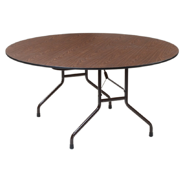 The Royal Industries COR BT 60 R Folding Banquet Table is expertly crafted for versatile use across various industry segments, particularly settings requiring flexible seating solutions. Featuring a round top with a diameter of 60 inches and a height of 29 inches, this table is engineered with a particle board core and a 5/8-inch melamine top, ensuring a sturdy and reliable surface suitable for both casual and formal events. It includes an automatic lock-open mechanism that simplifies setup and enhances safety. The bullnose edge T-molding not only adds to the aesthetic appeal but also offers additional durability. To protect floors from damage, mar-proof plastic foot caps are incorporated, complementing the design with practicality. The table stands on 1-inch steel tubing legs, providing robust support, while a walnut finish gives it a sophisticated and elegant look. The Royal Industries COR BT 60 R is ideal for banquet halls, conference centers, or even personal gatherings, delivering both form and function with its design. Its ability to fold offers convenient storage and ease of transport, making it a valuable asset for any venue seeking adaptable furniture solutions.