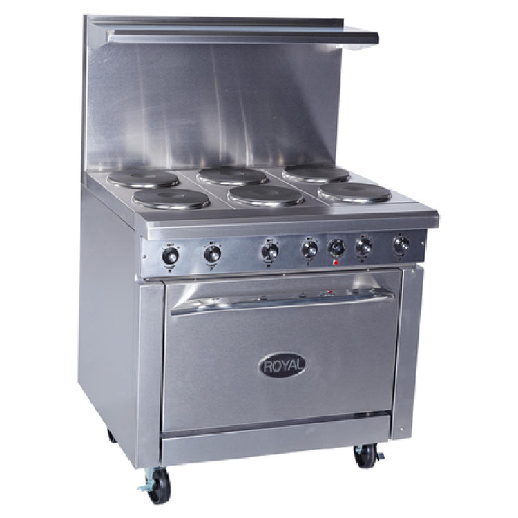 Royal Range of California, RRE-6-C_208/60/3, (QUICK SHIP) Restaurant Range, electric, 36", (6) 2.0 kW solid round 9" hotplates, infinite controls, convection oven, 5-surface porcelain oven interior, (1) 5-position chrome rack guide, (1) chrome rack, stainless steel front, sides, landing ledge, backguard, valve cover, kickplate, & high shelf, 6" legs, adjustable feet, 17.0kW, cCSAus, CSA-Sanitation, Made in USA
