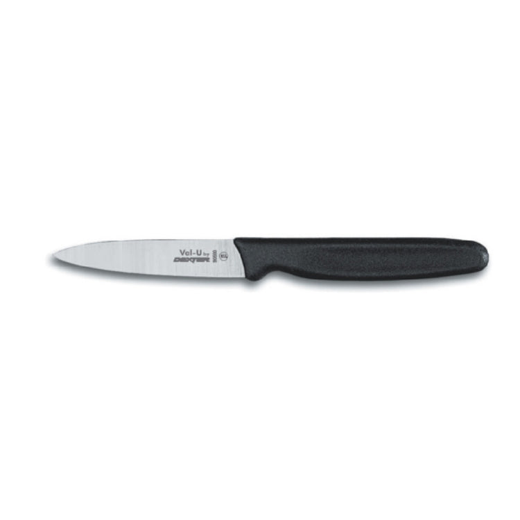 The Royal Industries RH 30500 Val-U Paring Knife is a meticulously crafted kitchen tool, featuring a 3-1/2" blade that is stamped for precision and reliability. This knife is made from DEXSTEEL™ stain-free, high carbon steel, ensuring durability and a sharp edge for intricate culinary tasks. Its straight-edge blade makes it ideal for peeling, trimming, and garnishing, catering to various needs in both home kitchens and professional culinary environments. The knife is designed with a finger guard to enhance safety during use, while the black polypropylene handle offers a comfortable grip, reducing fatigue during repetitive tasks. Additionally, its NSF certification verifies its compliance with public health and safety standards, making it a valuable tool for commercial kitchens. Each box contains 12 knives, representing a cost-effective solution for establishments requiring multiple units. Versatile and dependable, the Royal Industries RH 30500 Val-U Paring Knife stands out in its category, combining quality materials and thoughtful design to meet the diverse demands of its users.