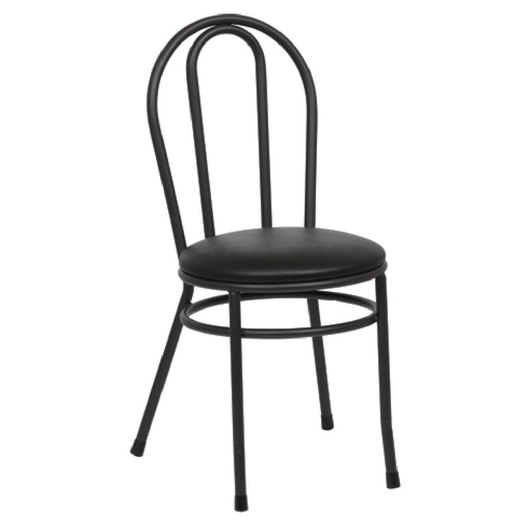 The Royal Industries ROY 717 B Bistro Side Chair Hairpin Back 35-1/2"H is a meticulously designed piece of furniture that combines durability with aesthetic appeal, making it suitable for a variety of dining environments. This chair features a 16" diameter plywood seat, which is complemented by a 1-7/8" thick high-density foam padding to ensure comfort for prolonged seating. The chair's structure is reinforced with an 18-gauge steel black frame, providing robust support and stability through additional support bars and a total of 14 welds. The design incorporates a hairpin back, adding a touch of elegance to its utilitarian purpose. Its black vinyl finish is not only visually appealing but also contributes to the chair's longevity by being scratch-resistant, thanks to a powder-coated finish. This thoughtful combination of materials and construction techniques makes the ROY 717 B Bistro Side Chair a versatile choice for bistros, cafés, and other casual dining settings that demand both style and endurance. The attention to detail in its design ensures that it stands up to regular use, meeting the rigorous demands of the hospitality industry while maintaining an inviting appearance. This chair is an exemplary choice for those seeking a blend of comfort, durability, and style in their dining furniture.