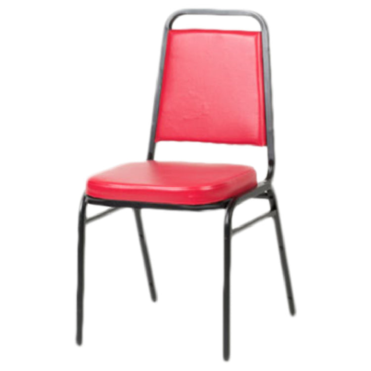 The Royal Industries ROY 718 R Stack Chair Square Back With Hand Hold 33-1/8"H is a meticulously crafted seating solution, ideal for various professional environments, including conference rooms, lecture halls, and banquet facilities. This chair is distinguished by its square back design, featuring a convenient hand hold for easy transportation and rearrangement. The seating comfort is enhanced by the 1-7/8" thick high-density foam padding, upholstered in durable red vinyl, which provides both aesthetic appeal and enduring comfort. Constructed with an 18-gauge steel black frame, the chair is fortified with additional support bars and 14 robust welds, ensuring durability and stability in high-traffic settings. The frame's scratch-resistant powder-coated finish guarantees a long-lasting, pristine appearance, even with frequent use. With a height of 33-1/8", this stack chair is designed to accommodate users in various settings while offering the versatility of easy stacking for efficient storage. The Royal Industries ROY 718 R Stack Chair represents a harmonious blend of functionality and design, making it a valuable asset for venues seeking to balance quality seating solutions with stylish aesthetics.