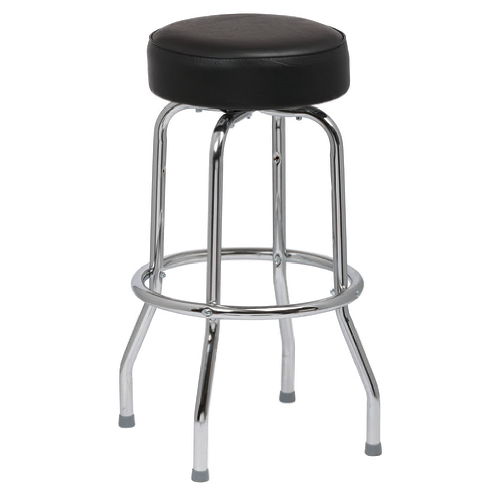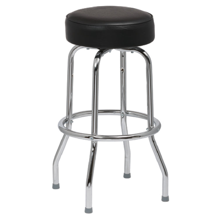 The Royal Industries ROY 7711 B Bar Stool is a meticulously crafted seating solution that combines functionality with sleek design, making it an ideal fit for various segments within the hospitality and entertainment industries. Standing at 30 inches in height with a 14-inch diameter, this bar stool features a robust chrome frame that ensures durability and a modern aesthetic. The 4-inch thick tailored seat, complemented by a single sewn welt, provides exceptional comfort, supported by a 1-inch thick padding that enhances the seating experience. A notable feature of this stool is its ball bearing swivel mechanism, allowing for smooth 360-degree rotation, catering to the dynamic environment of bars and restaurants. The tee-nut construction of the single ring base adds to its stability and strength. Finished in heavy-duty black vinyl, the ROY 7711 B is designed to withstand rigorous use, while the plastic glides ensure easy movement across different flooring surfaces without causing damage. This backless, round stool is supplied in a knocked-down format, making it convenient for assembly and transport. Its combination of style, comfort, and functionality makes the Royal Industries ROY 7711 B Bar Stool a versatile choice for any commercial setting.