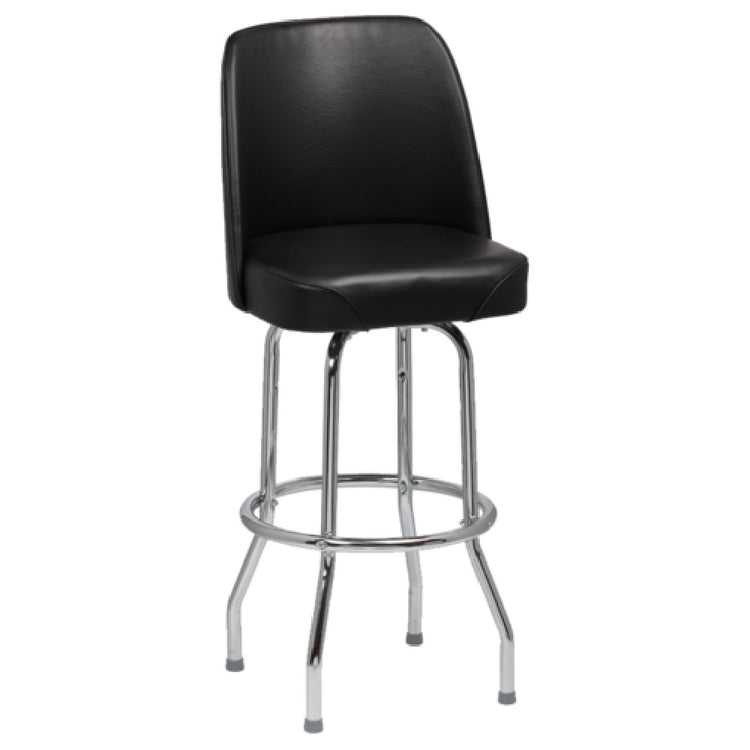 The Royal Industries ROY 7721 B Bucket Bar Stool is a meticulously designed seating solution that caters to various market segments, including hospitality venues, bars, and restaurants. This bar stool features a high back and a heavy foam padded waterfall seat, providing exceptional comfort and support for extended seating durations. It incorporates a 3° heavy-duty ball bearing swivel, allowing for smooth and effortless 360-degree rotation. The t-nut construction ensures robust durability and stability, making it suitable for high-traffic environments. Equipped with plastic glides, it protects floors from scratches and marks. The stool's chrome frame is complemented by a single ring, adding to its structural integrity and aesthetic appeal. Featuring a fabric back with black vinyl, the ROY 7721 B is not only durable but also easy to clean, maintaining a sleek appearance over time. The stool is delivered knocked down, facilitating convenient storage and transportation. The combination of these features makes the Royal Industries ROY 7721 B an attractive and practical choice for establishments seeking furniture that balances style, comfort, and durability.