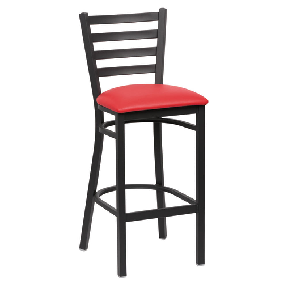 The Royal Industries ROY 9002 RED Bar Stool Ladder Back 17"L X 16-1/2"W X 43-3/8"H is a meticulously designed seating solution that caters to a variety of settings including restaurants, bars, and home kitchens. This bar stool features a classic ladder back design, which not only provides comfortable lumbar support but also adds a touch of elegance to any interior space. With dimensions of 17 inches in length, 16-1/2 inches in width, and 43-3/8 inches in height, the stool offers a balanced blend of comfort and style, making it an ideal choice for spaces requiring both aesthetics and functionality. The upholstered red vinyl cushion seat ensures durability and easy maintenance, while the metal frame with a matte black finish provides a sturdy and attractive base. Further enhancing its longevity and stability are the nylon footings, designed to protect floors and offer additional support. This combination of materials and thoughtful design makes the Royal Industries ROY 9002 RED Bar Stool a versatile seating option, appealing to different market segments looking for quality, style, and practicality in their seating choices.