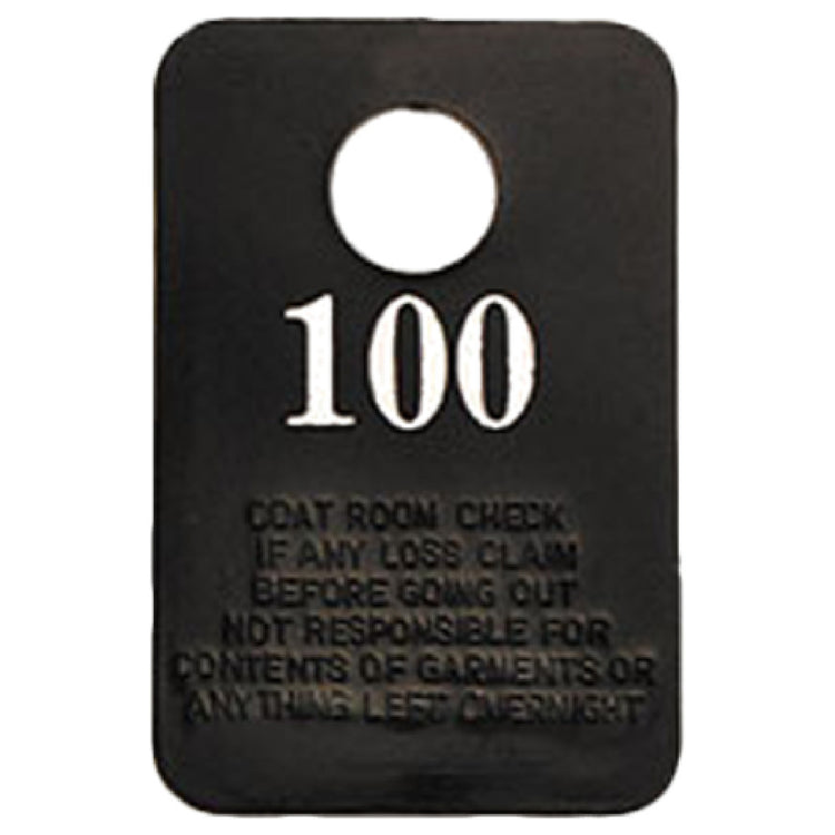 The Royal Industries ROY CRC 1-100 Coat Check is a meticulously designed product tailored to meet the organizational needs of businesses like hotels, restaurants, and event venues. Measuring 2 inches by 3 inches, each coat check is constructed from durable black plastic, ensuring long-lasting use and reliability. The tags feature a 1/2-inch diameter opening, providing an easy attachment to coat hangers or garment racks, enhancing the efficiency of coat management. They are numbered from 1 to 100, which allows for systematic organization and quick retrieval of items. The contrasting white lettering against the black background ensures clear visibility, thus minimizing any potential misplacement of items. The Royal Industries ROY CRC 1-100 Coat Check is an essential tool for any establishment that values order and efficient service in their coat check operations. This product provides a streamlined solution for tracking garments, making it an invaluable asset for various industry segments that require organized and professional garment management systems. Its simple yet effective design supports businesses in maintaining high standards of customer service by ensuring that patrons' belongings are managed with care and precision.