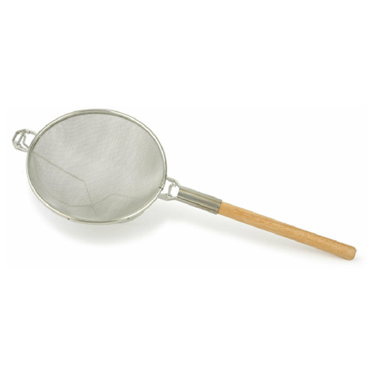 The Royal Industries ROY DMS 14 FINE Strainer is a premium kitchen tool, featuring a 14-inch diameter bowl designed for a variety of culinary applications. Crafted with double-tinned fine mesh wire, this strainer ensures optimal strength and durability, making it ideal for sifting and straining tasks in both professional and home kitchens. The inclusion of a pan hook enhances stability, allowing for hands-free use over pots and pans. Reinforced bands add to the structural integrity, ensuring that the strainer maintains its shape even under frequent use. The wood handle provides a comfortable grip, reducing hand fatigue during extended use. This thoughtfully constructed strainer is a versatile option for chefs and culinary enthusiasts who require precision and reliability in their kitchen tools. Its combination of durable materials and ergonomic design makes it a unique value proposition for those in the food service industry seeking long-lasting, high-performing kitchen equipment.