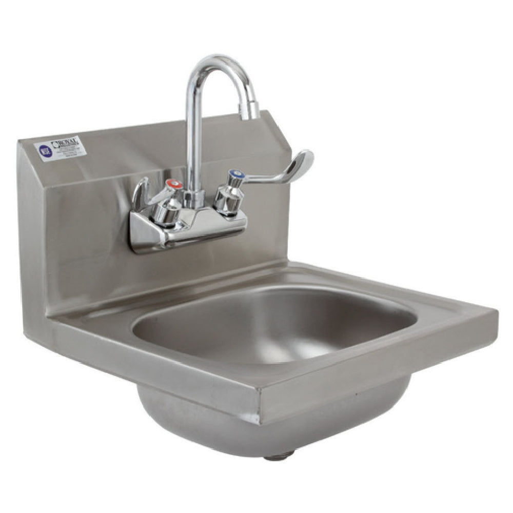 Royal Industries ROY HSW 15 Hand Sink is a wall-mounted unit, specifically engineered for environments where space efficiency and hygiene are paramount. It features a bowl size of 10 inches x 12-3/4 inches x 6 inches deep, providing ample space for handwashing tasks in commercial kitchens, healthcare facilities, or any setting where sanitation is crucial. The sink is equipped with a 1-1/2 inch drain basket, ensuring efficient water drainage. Constructed from 20-gauge T-304 stainless steel, it delivers durability and resistance to corrosion, which is essential for high-traffic environments. The unit includes a standard duty 4-inch OC splash-mounted faucet with a gooseneck spout, designed according to low lead standards (