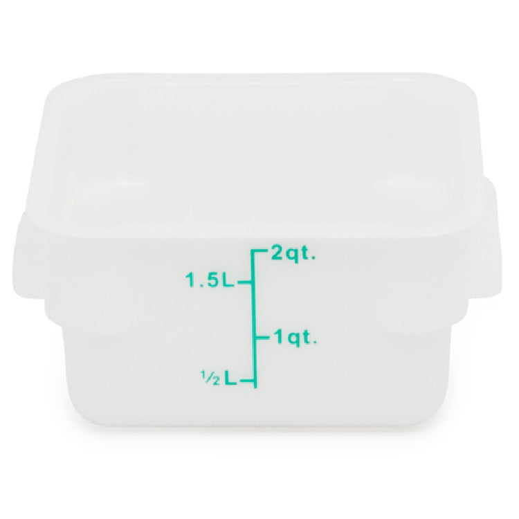 The Royal Industries ROY PPSC 2 Storage Container - 2 Qt. Square is an essential asset for professional kitchens, offering a practical storage solution with its 2-quart capacity. Crafted from durable polypropylene, this container is ideal for a wide range of food storage applications. Its square shape maximizes storage efficiency, allowing for easy stacking and space-saving in commercial environments. The inclusion of graduated markings provides precise measurement capabilities, enhancing portion control and inventory management in food service operations. While this model does not come with a lid, it is designed to maintain food safety standards and is NSF certified, ensuring compliance with health and safety regulations. The container's white color allows for easy labeling and content identification, contributing to an organized kitchen workflow. Suitable for use in various segments of the food industry, from catering services to restaurant kitchens, the Royal Industries ROY PPSC 2 offers a reliable and hygienic solution to meet the demands of food storage and management. This storage container is a testament to Royal Industries' commitment to quality and practicality, making it a valuable addition to any culinary setting.