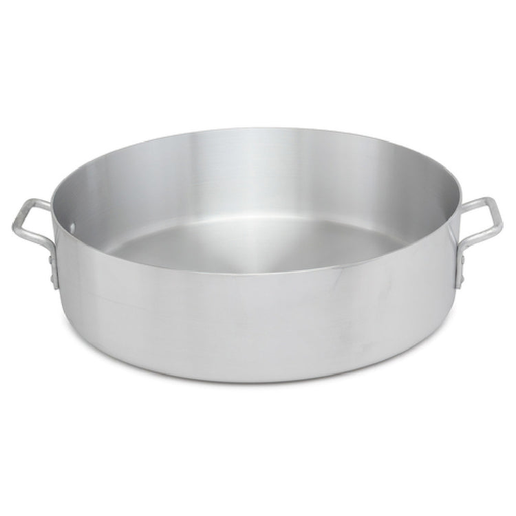 The Royal Industries ROY RBAZ 35 Brazier 35 Qt. Without Cover is a versatile cookware piece designed for professional kitchens demanding medium-weight, durable equipment. This brazier is meticulously crafted from aluminum, boasting a substantial thickness of 4mm, ensuring even heat distribution and long-lasting performance. With a generous capacity of 35 quarts, it is ideal for preparing large quantities of food, making it a valuable asset for catering services, restaurants, and hospitality industries. The brazier features riveted handles, providing robust support and ease of handling during transport and cooking, which is crucial for maintaining efficiency in high-paced kitchen environments. Its aluminum construction not only offers excellent thermal conductivity but is also NSF certified, affirming its compliance with strict public health and safety standards. Although the brazier comes without a cover, its design facilitates versatility and adaptability for various cooking methods, such as braising, stewing, or slow cooking meats and vegetables, which are essential techniques in diverse culinary practices. The Royal Industries ROY RBAZ 35 Brazier is a reliable choice for chefs who prioritize functionality and durability in their kitchen apparatus, contributing significantly to high-volume commercial cooking operations.