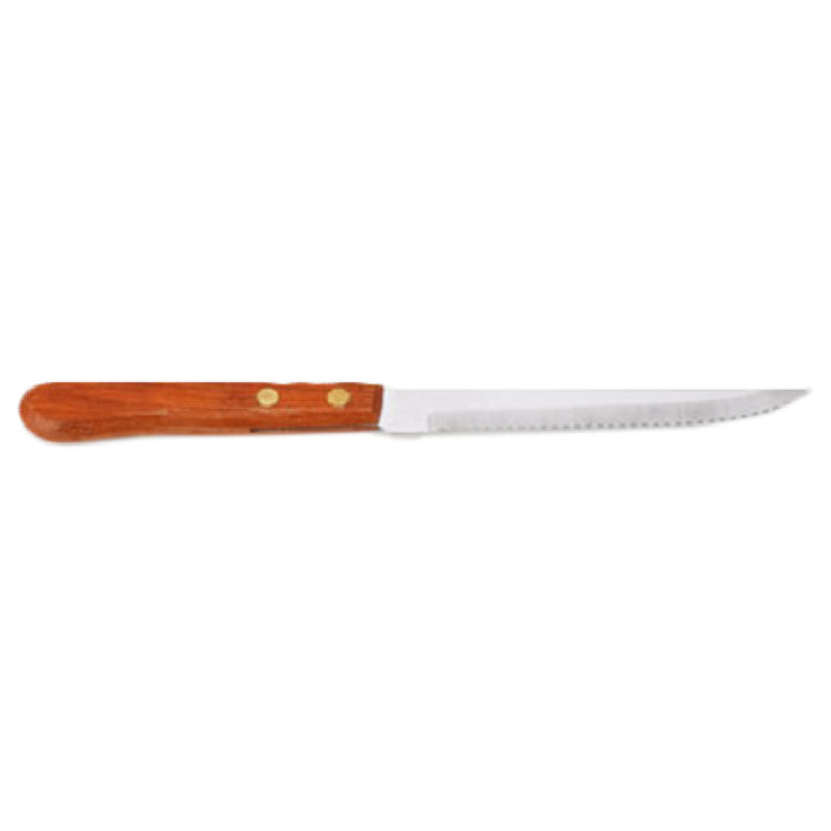 The Royal Industries ROY RSK 2 Economy Steak Knife is a meticulously crafted kitchen tool featuring an 8-inch length and a 4-1/2-inch long hollow ground blade. This serrated knife, with its pointed tip, is designed for precise and efficient cutting, making it an essential utensil for culinary professionals and home cooks alike. The blade is constructed from high-quality stainless steel, ensuring durability, corrosion resistance, and long-lasting sharpness. Complementing the robust blade is a wooden handle, which provides a comfortable grip and adds a touch of elegance to the knife's overall aesthetic. The Royal Industries ROY RSK 2 is particularly suitable for both commercial and residential use, offering an economical solution without compromising on performance. Its design is tailored to meet the demands of steak preparation, ideal for steakhouses, restaurants, and catering businesses that require reliable and efficient cutlery. This steak knife's balanced craftsmanship and practical features make it a versatile addition to any dining setting, fulfilling the needs of various market segments within the food service industry. The Royal Industries ROY RSK 2 Economy Steak Knife is valued for its combination of functionality, economy, and classic design.