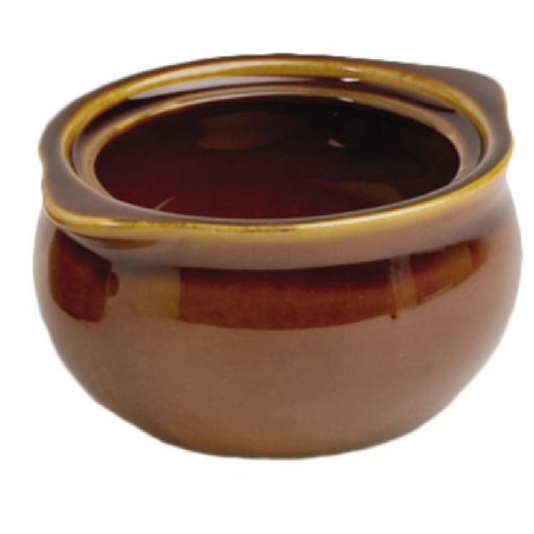 Royal Industries ROY SOUP 12 Soup Crock is a meticulously designed ceramic crock, offering a capacity of 12 ounces, making it ideal for serving individual portions of soup. The crock's elegant caramel color adds a touch of sophistication to any table setting, catering to both casual and upscale dining environments. Sold exclusively in case quantities, with each case containing 2 dozen crocks, this product is perfect for restaurants, catering services, and hospitality institutions that require high-volume service solutions. The ceramic construction of the ROY SOUP 12 ensures excellent heat retention, keeping soups warm for extended periods, thus enhancing the dining experience. Moreover, its durable material withstands the rigors of daily use in busy kitchens, while maintaining an easy-to-clean surface. This soup crock not only serves practical purposes but also enhances the aesthetic appeal of food presentation, making it a versatile option for diverse market segments that prioritize quality, durability, and style in their tableware solutions.