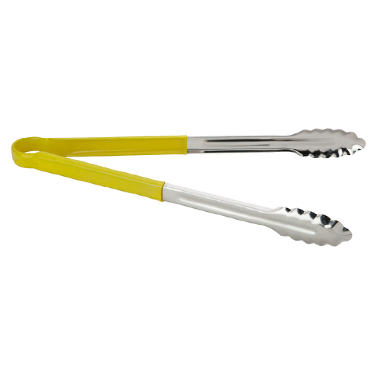 The Royal Industries ROY TSC 16 Y Utility Tongs 16" 1-piece are expertly designed kitchen tools constructed from high-quality stainless steel, ensuring durability and resistance to corrosion. Measuring 16 inches in length, these utility tongs are ideal for handling a variety of food items, providing both precision and reach in culinary tasks. The 7mm thickness of the tongs adds to their robustness, offering a reliable grip for chefs and culinary enthusiasts alike. A distinctive feature of these tongs is the color-coded yellow handle, which not only enhances grip but also supports kitchen organization and safety protocols by distinguishing them from other utensils. This makes them particularly valuable in commercial kitchens where cross-contamination prevention is crucial. The Royal Industries ROY TSC 16 Y Utility Tongs are a functional addition to the food service industry, catering to sectors ranging from restaurants and catering services to food processing units. Their single-piece construction offers seamless performance and easy maintenance, making them an indispensable tool for professional chefs and home cooks who prioritize efficiency and hygiene in their culinary endeavors. These utility tongs represent a blend of practicality and design, delivering reliable performance across various cooking environments.