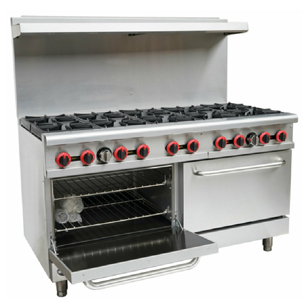 SABA , GR-60, Restaurant Range, gas, 60"W, (10) 30,000 BTU open cast iron burners, 12" x 12" cast iron grates, thermostat controls, pilot, pull-out crumb tray, (2) standard ovens, "U" shape oven burner with 31,000 BTU/hr. each, safety valve, stainless steel front, sides, back riser & shelf, adjustable legs, 362,000 BTU, cETLus, ETL-Sanitation