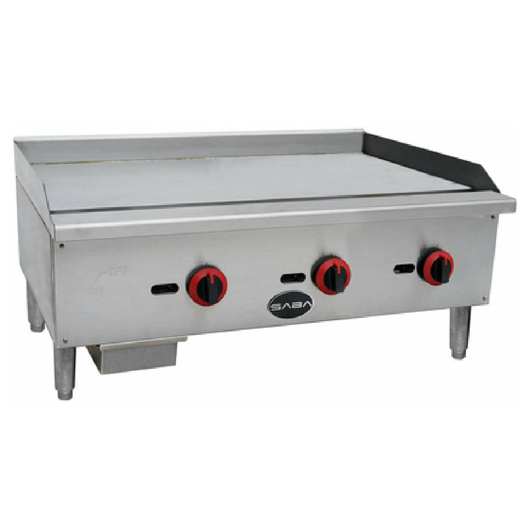 SABA , MG-36T, Griddle, countertop, gas, 36"W x 19"D cooking surface, 5/8" thick polished griddle plate, "U" shape burner each 30,000 BTU/hr., thermostatic controls, pilot, splash guard, grease collector, stainless steel front & sides, adjustable legs, 90,000 BTU, cETLus, ETL-Sanitation