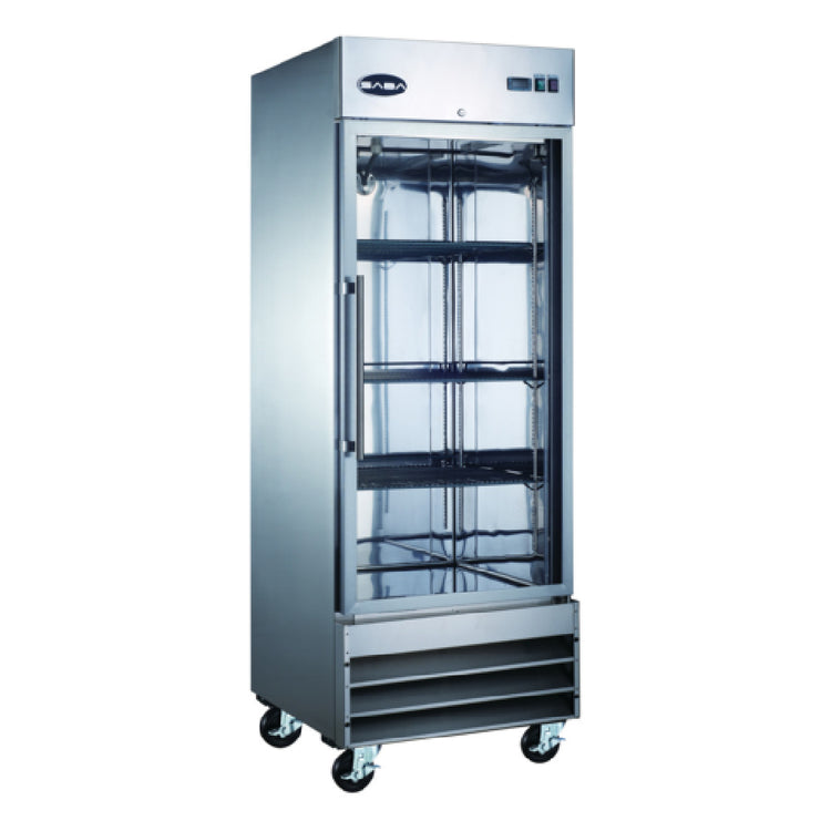 SABA , S-23FG, Freezer Merchandiser, reach-in, one-section, 29"W, 23.0 cu. ft., 650 liter capacity, electronic control with digital display, (1) full-height glass door, pull handle, (3) adjustable shelves, self-contained bottom mounted refrigeration, stainless steel interior & exterior, (4) 5" casters (2 with front brakes), 3/4 HP, 115v/60/1-ph, 9.6 amps, NEMA 5-15P, cETLus, NSF