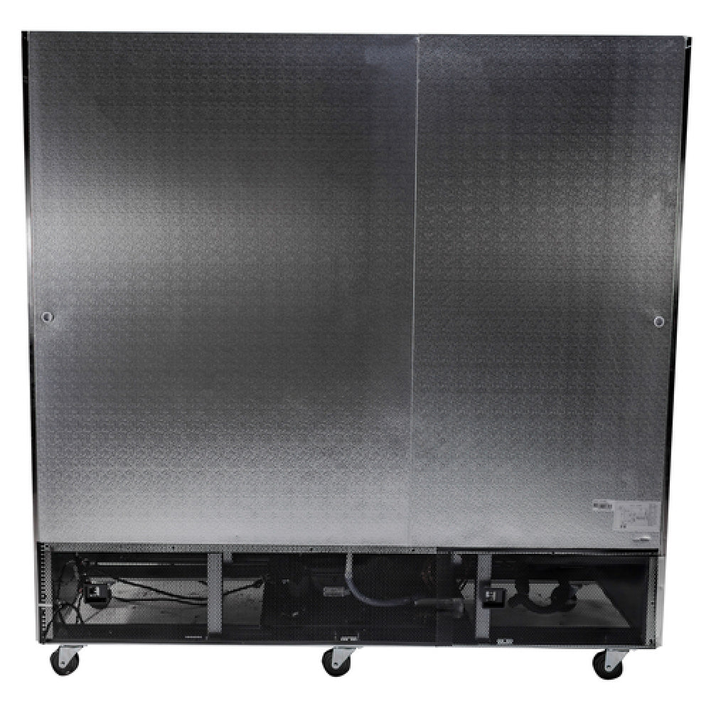 SABA , S-72RG, Refrigerator Merchandiser, reach-in, three-section, 80-7/8"W, 72.0 cu. ft., 2040 liter capacity, electronic control with digital display, (3) full-height glass doors, pull handles, (9) adjustable shelves, LED interior lighting, self-contained bottom mounted refrigeration, stainless steel interior & exterior, (4) 5" casters (2 with front brakes), 3/4 HP, 115v/60/1-ph, 10.4 amps, NEMA 5-15P, cETLus, NSF