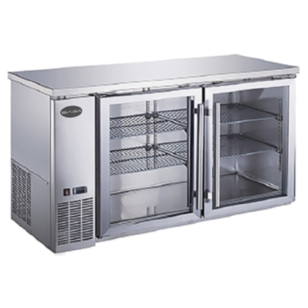 SABA , SBB-24-60GSS, Back Bar Cooler, two-section, 60-3/4" W, 15.8 cu. ft./446 liter capacity, (2) glass doors, (4) shelves, LED interior lighting, digital temperature control, range 33°F to 38°F, R134a refrigerant, self-contained side mounted refrigeration, stainless steel exterior, (4) 4" casters, 1/3 HP, 115v/60/1-ph, 6.4 amps, NEMA 5-15P, cETLus, NSF