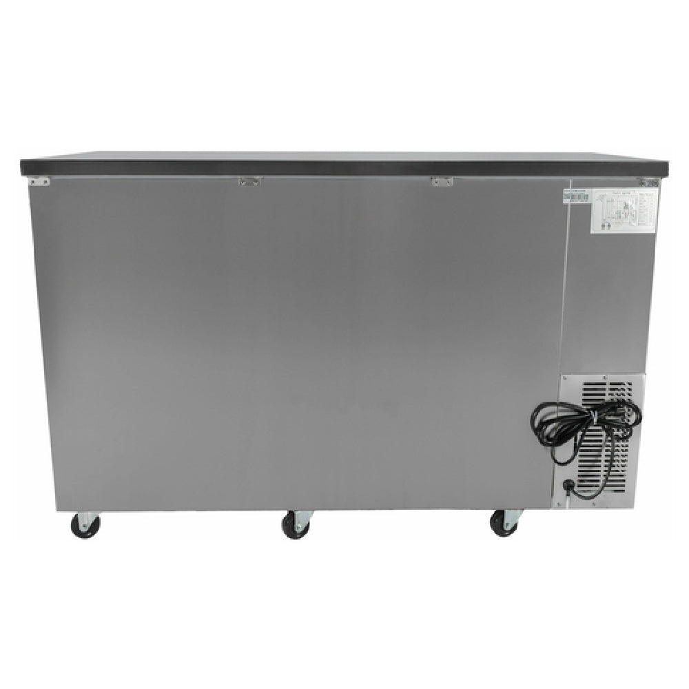 SABA , SBB-24-60SS, Back Bar Cooler, two-section, 60-3/4" W, 15.8 cu. ft./446 liter capacity, (2) solid doors, (4) shelves, LED interior lighting, digital temperature control, range 33°F to 38°F, R134a refrigerant, self-contained side mounted refrigeration, stainless steel exterior, (4) 4" casters, 1/3 HP, 115v/60/1-ph, 6.4 amps, NEMA 5-15P, cETLus, NSF