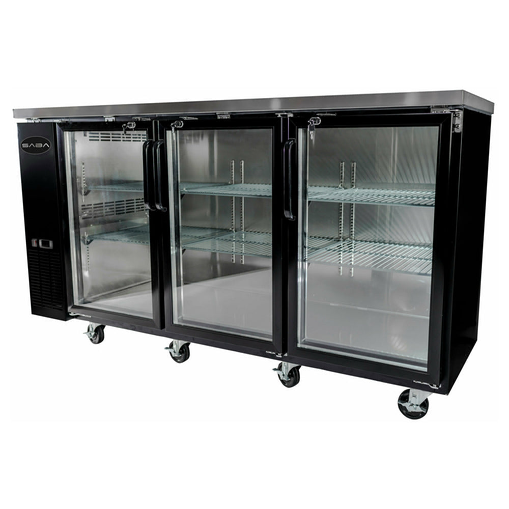 SABA , SBB-24-72G, Back Bar Cooler, three-section, 72-3/4" W, 19.6 cu. ft./556 liter capacity, (3) glass doors, (6) shelves, LED interior lighting, digital temperature control, range 33°F to 38°F, R134a refrigerant, self-contained side mounted refrigeration, black exterior, (4) 4" casters, 1/3 HP, 115v/60/1-ph, 7.4 amps, NEMA 5-15P, cETLus, NSF