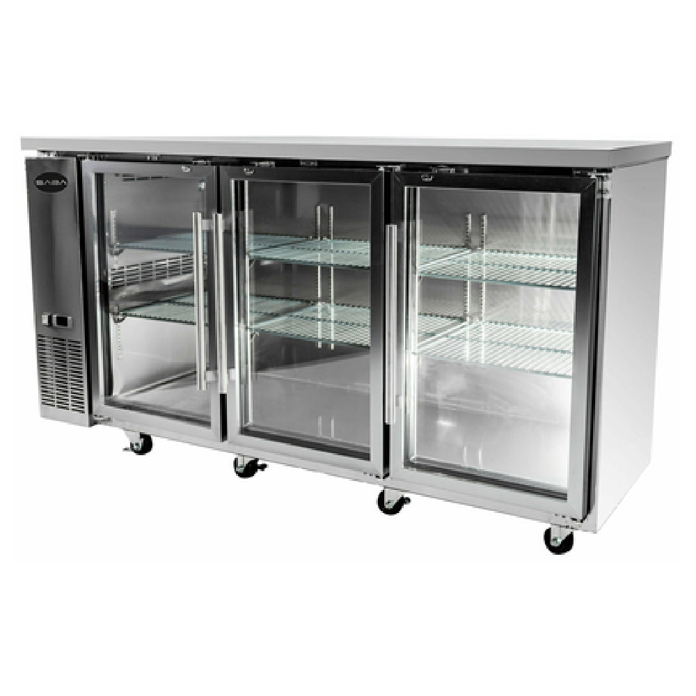 SABA , SBB-24-72GSS, Back Bar Cooler, three-section, 72-3/4" W, 19.6 cu. ft./556 liter capacity, (3) glass doors, (6) shelves, LED interior lighting, digital temperature control, range 33°F to 38°F, R134a refrigerant, self-contained side mounted refrigeration, stainless steel exterior, (4) 4" casters, 1/3 HP, 115v/60/1-ph, 7.4 amps, NEMA 5-15P, cETLus, NSF
