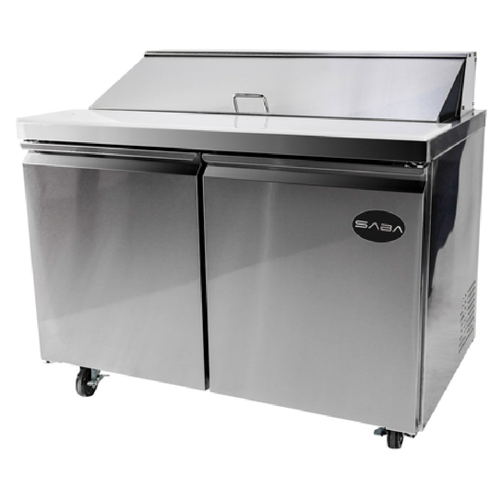 SABA , SPS-48-12, Sandwich/Salad Prep Table, two-section, 46-3/4" W, 9.5 cu. ft./268 liter capacity, holds (12) 1/6 pans, analog temperature control, range 33 °F to 41°F, insulated lid, cutting board, (2) doors & adjustable shelves, self-contained rear mounted refrigeration, stainless steel exterior & interior, (4) 5" casters, 1/3 HP, 115v/60/1-ph, 7.8 amps, NEMA 5-15P, cETLus, NSF