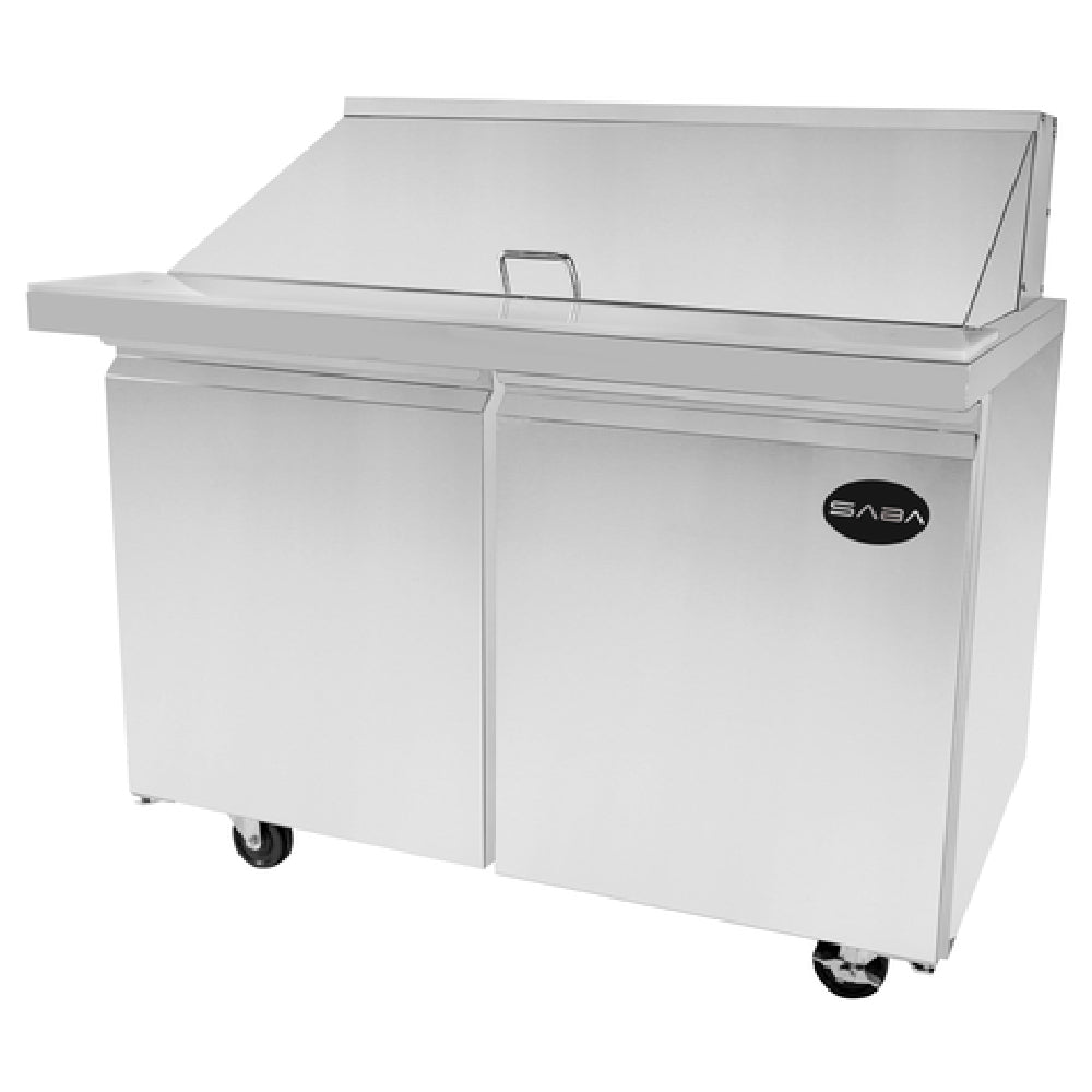 SABA , SPS-48-18M, Mega-Top Sandwich/Salad Prep Table, two-section, 46-3/4" W, 9.5 cu. ft./268 liter capacity, holds (18) 1/6 pans, analog temperature control, range 33 °F to 41°F, insulated lid, cutting board, (2) doors & adjustable shelves, self-contained rear mounted refrigeration, stainless steel exterior & interior, (4) 5" casters, 1/3 HP, 115v/60/1-ph, 7.8 amps, NEMA 5-15P, cETLus, NSF
