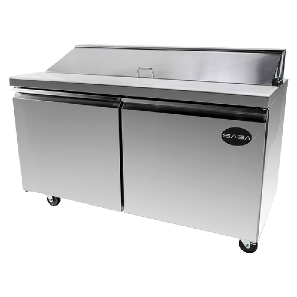 SABA , SPS-60-16, Sandwich/Salad Prep Table, two-section, 60-1/4" W, 15.0 cu. ft, /428 liter capacity, holds (16) 1/6 pans, analog temperature control, range 33 °F to 41°F, insulated lid, cutting board, (2) doors & adjustable shelves, self-contained rear mounted refrigeration, stainless steel exterior & interior, (4) 5" casters, 1/3 HP, 115v/60/1-ph, 7.8 amps, NEMA 5-15P, cETLus, NSF