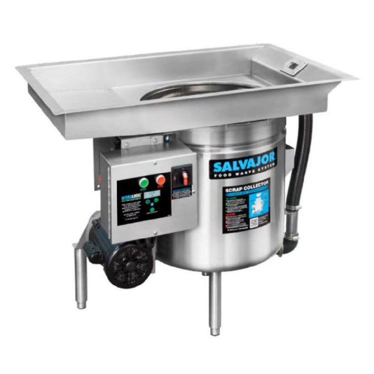 The Salvajor P914_115/60/1 Pot/Pan Scrap Collector™ is a cutting-edge scrapping, pre-flushing, and collecting system specifically designed for environments where disposers are restricted. This system is equipped with a NEMA 4 HYDROLOGIC® control panel featuring a patented operator sensor and offers two water-saving modes: timed run and auto start/stop. Its advanced safety line disconnect and LCD readout enhance operational safety and monitoring efficiency. The system includes a salvage basin and silverware trap, along with a scrap basket to efficiently manage waste. Powered by a robust 3/4 HP corrosion-resistant pump, it features a pump intake screen to ensure smooth operation. Constructed from stainless steel, this system is built for durability and reliability in demanding kitchen environments. The Salvajor P914_115/60/1 is UL, CSA, CE, and NSF certified, affirming its adherence to stringent safety and performance standards. This product caters to diverse market segments, offering a sustainable and efficient solution for commercial kitchens, particularly in regions with strict disposal regulations. Its innovative design and resource efficiency make it a valuable asset for any professional food service operation seeking to optimize waste management while maintaining compliance with environmental guidelines.